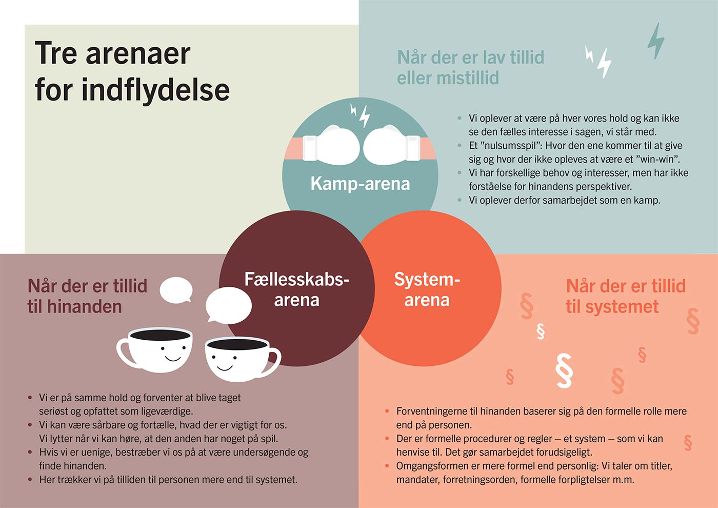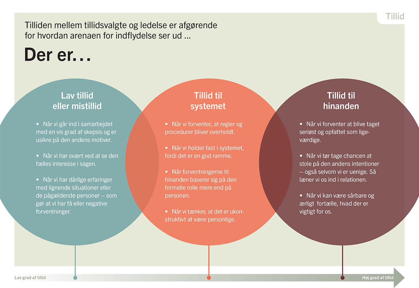 Rummet for indflydelse skabes i høj grad af tilliden med dig som AMR eller TR og din ledelse. Derfor er det vigtigt at tage stilling til graden af tillid i jeres samarbejde (første billede). Ud fra graden af tillid kan vi tale om tre forskellige arenaer for indflydelse (andet billede)